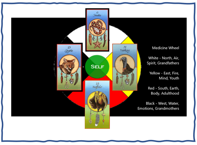 Joining Snake – in this 2nd week of Hawk month in the year of the Great Mother Bear are Turkey, Buffalo, and Coyote.
