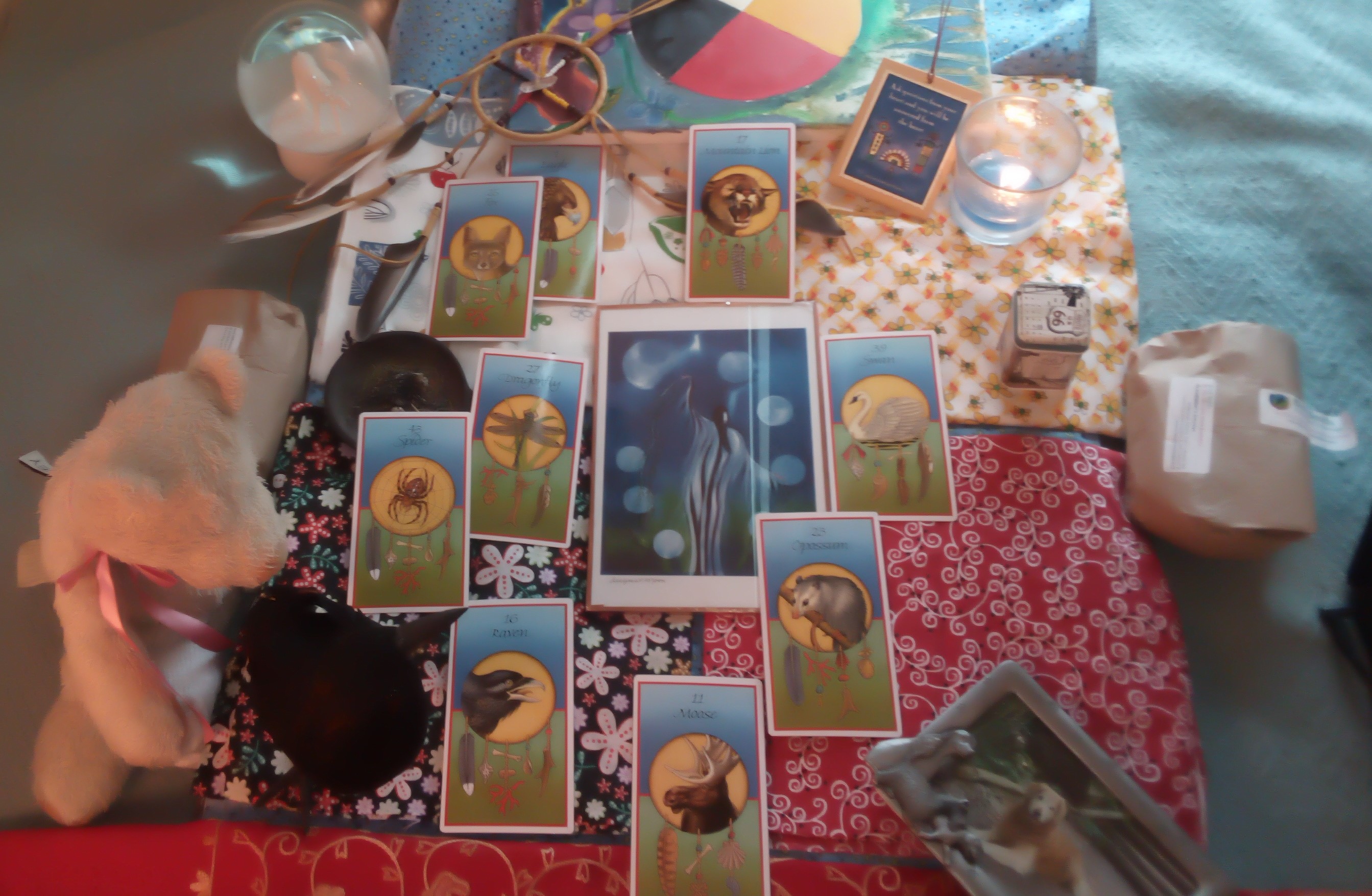 If you choose a Medicine Wheel reading, we look at your experience through your sacred belongings and where you place them on your own Medicine Wheel. We will look at these parts of your life through the Indigenous worldview, the language of symbolism, archetypes, mysticism, and the totems and talk about what they mean to you.